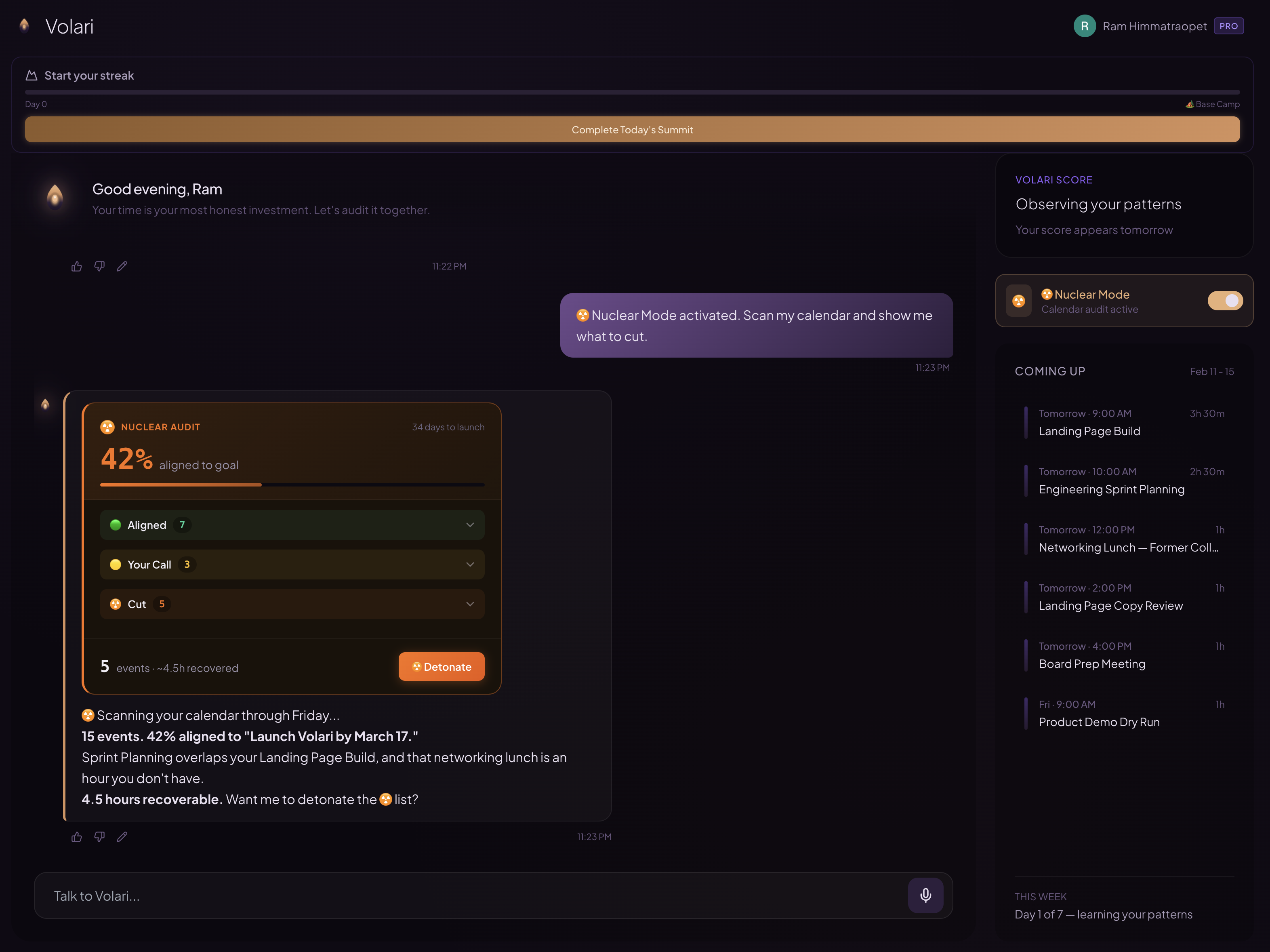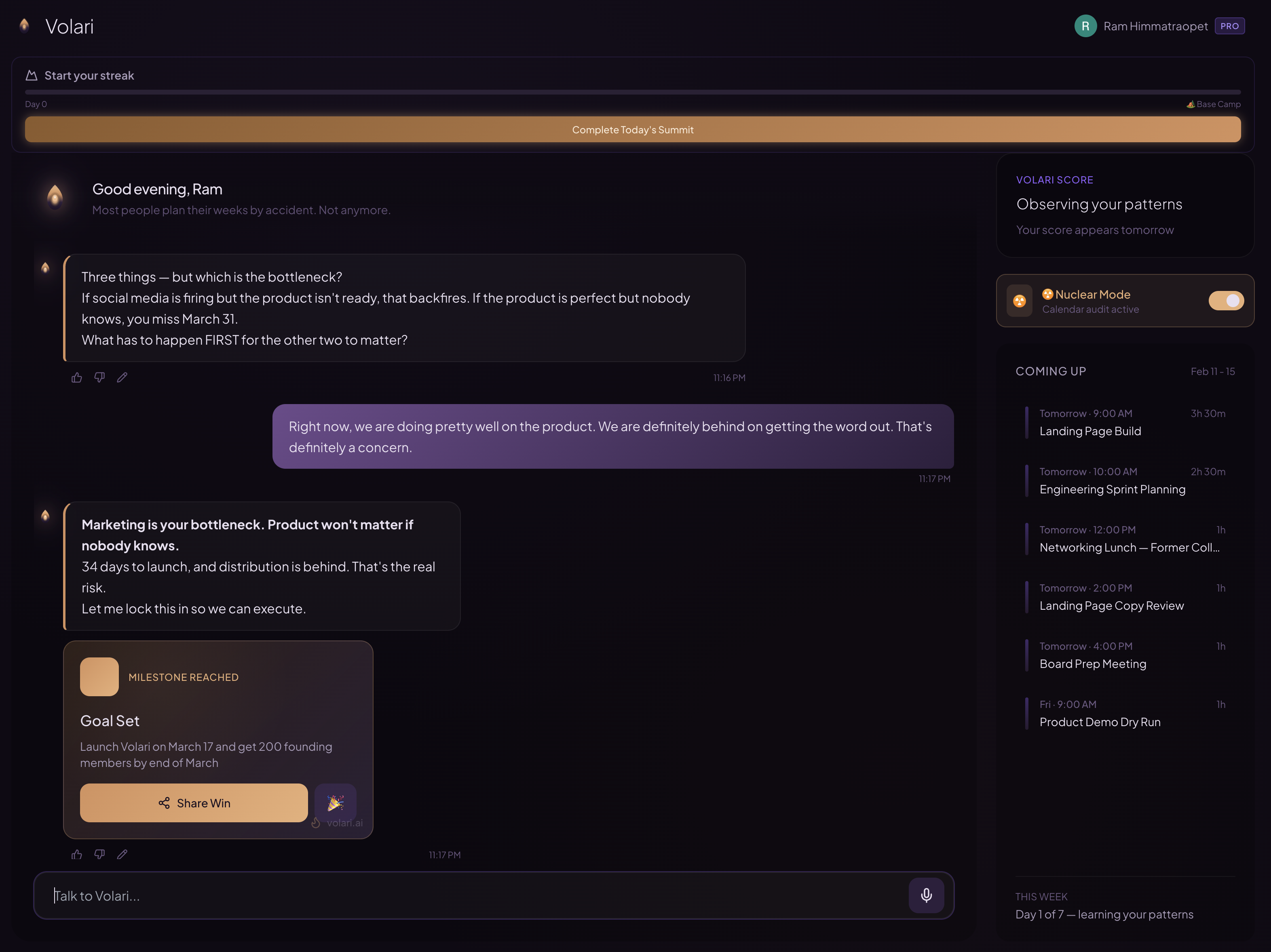 Volari combines all of this into one AI partner - the strategic thinking, the pattern intelligence, and the calendar execution power - purpose-built for one thing: improving your ability to execute.